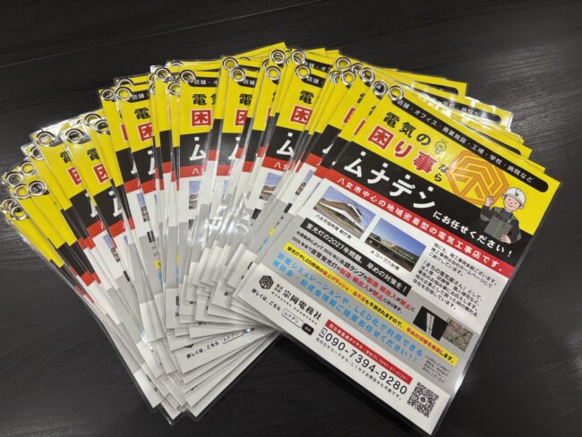 デザインは、表面で会社紹介や蛍光灯の2027年問題の注意喚起、裏面はチラシを配布する先でPRしたいサービスメニューを配置しました。