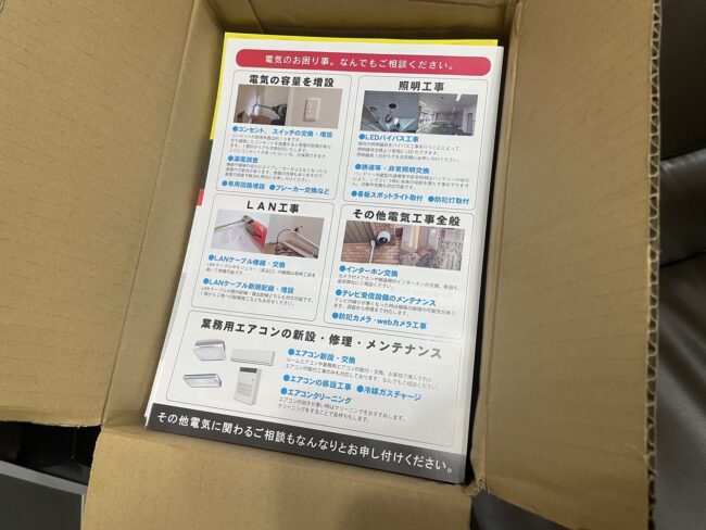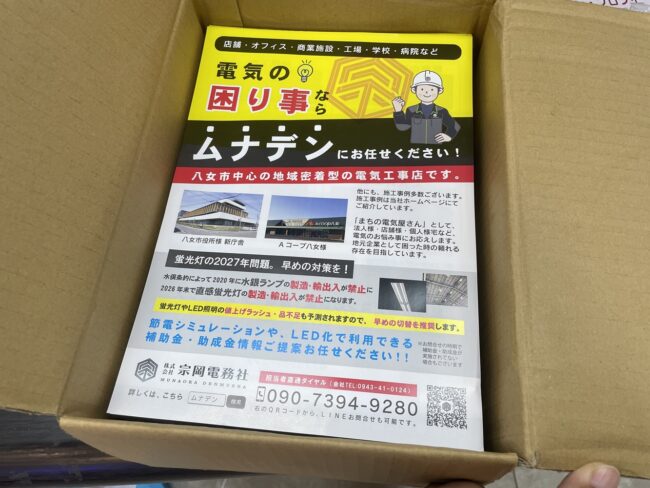 デザインは、表面で会社紹介や蛍光灯の2027年問題の注意喚起、裏面はチラシを配布する先でPRしたいサービスメニューを配置しました。
