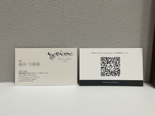 https://soin-atra.jp/Nail salon Soin(ソワン)様は、名刺やホームページ制作などをご依頼いただいている株式会社ATRA様の新規事業のネイルサロンの店舗様になります。